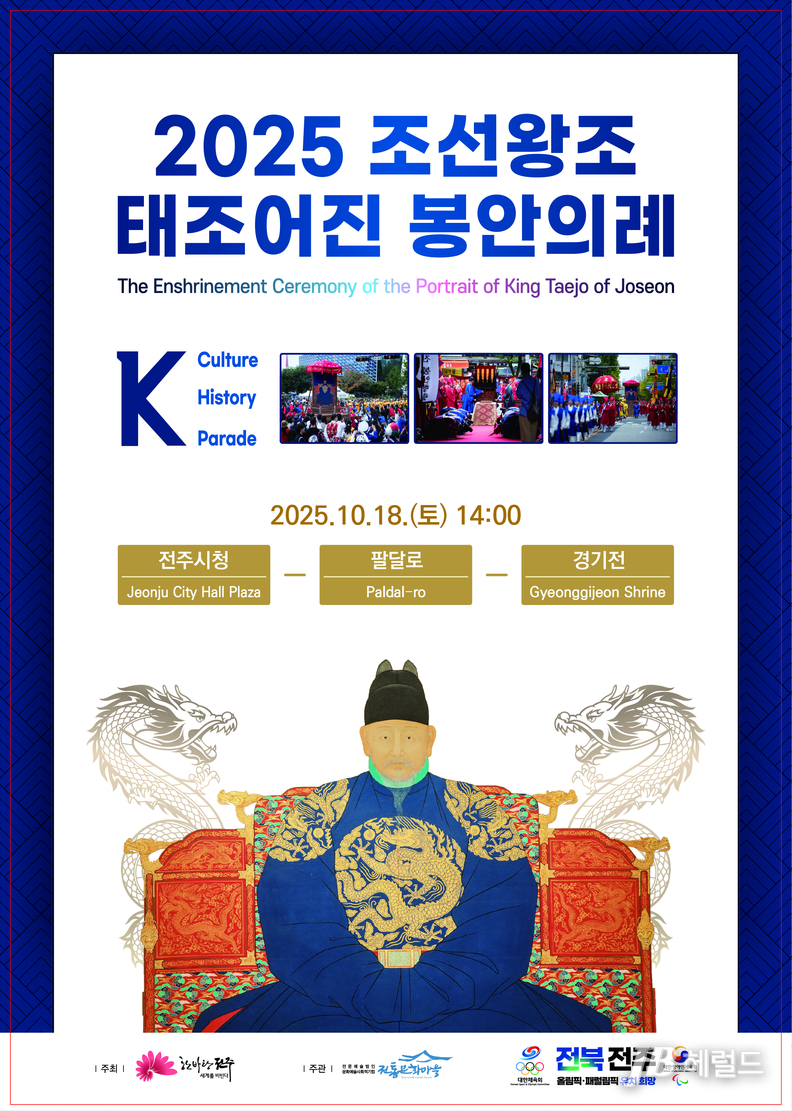 2025 조선왕조 태조어진 봉안의례 재현행사가 18일 토요일 오후 2시 전주시청부터 팔달로를 거쳐 경기전까지, 봉안의례 재현행사를 통해 시민들에게 조선왕조의 본향인 전주의 문화적 가치를 알리며 역사의 향기로 거리를 물들일 예정이다.