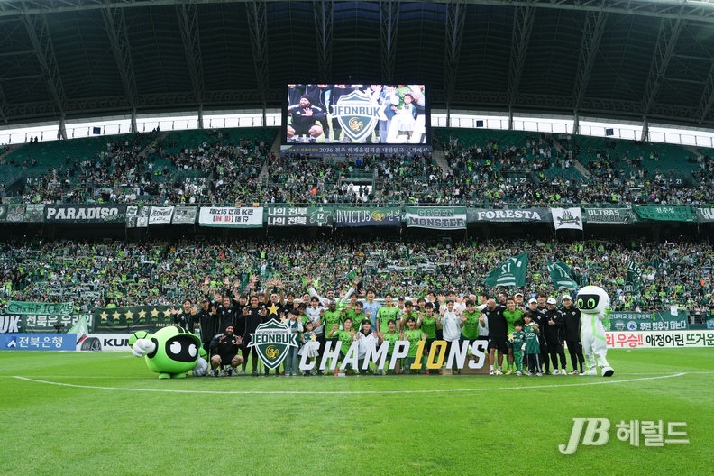 당일 2위 김천상무가 FC안양과의 경기에서 패배하며 38라운드까지의 남은 경기 결과와 상관없이 K리그1 최초 10번째 우승이라는 역사적인 이름에 ‘전북현대모터스FC’를 새겼다.