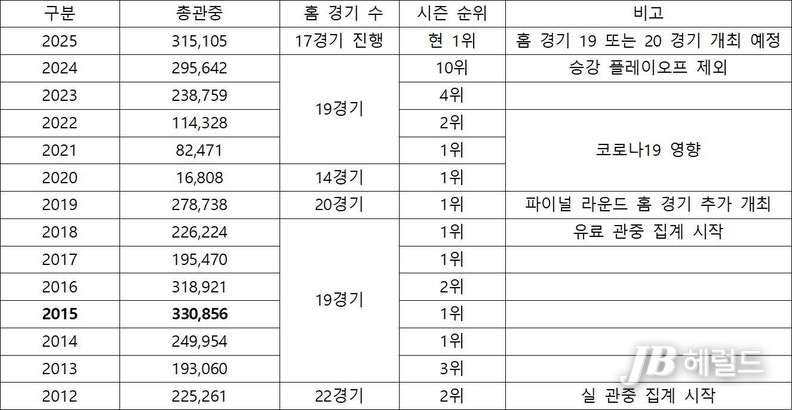 - 올 시즌 팀의 부활을 뒷받침하듯 홈 관중 유치에서도 역대급 흥행을 기록하고 있다.