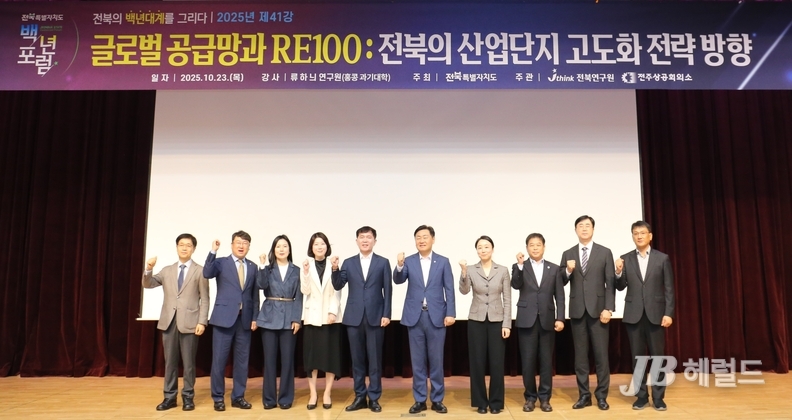전북연구원은 23일 전북특별자치도청 대회의실에서 「전북 백년포럼」 제41강을 개최하였다. 이번 포럼은 ‘글로벌 공급망과 RE100: 전북의 산업단지 고도화 전략 방향’을 주제로, 홍콩과기대(광저우) 류하늬 연구원이 강연을 진행했다.