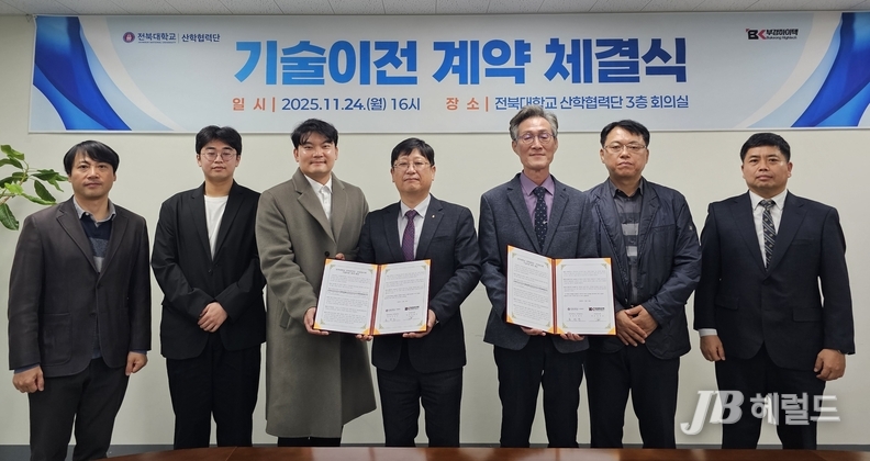 전북대학교 산학협력단(단장 손정민)은 부경하이텍(대표 정종균)과 11월 24일 오후4시 1억 원의 기술이전 계약을 체결했다. 이날 체결식에는 손정민 전북대학교 산학협력단장, 부경하이텍 정종균 대표, 기술의 개발자인 김성륜 교수(대학원 탄소융복합재료공학과)등이 참석하여 협력 의지를 다졌다.