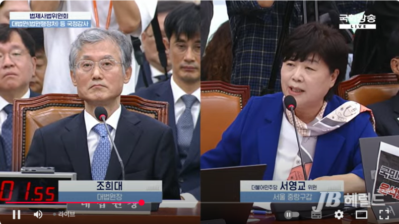 조희대 대법원장이 대법원 국정감사에 출석했지만 여야의 강한 충돌에 이은 더불어민주당 의원들의 질의에 아무런 답변을 하지 않고 오전 정회 시간 자리를 떴다.