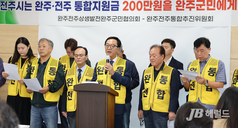 전주·완주 통합단체가 전주시와 시의회에 완주 군민에 통합지원금 200만원을 지급해 줄 것을 건의했다.