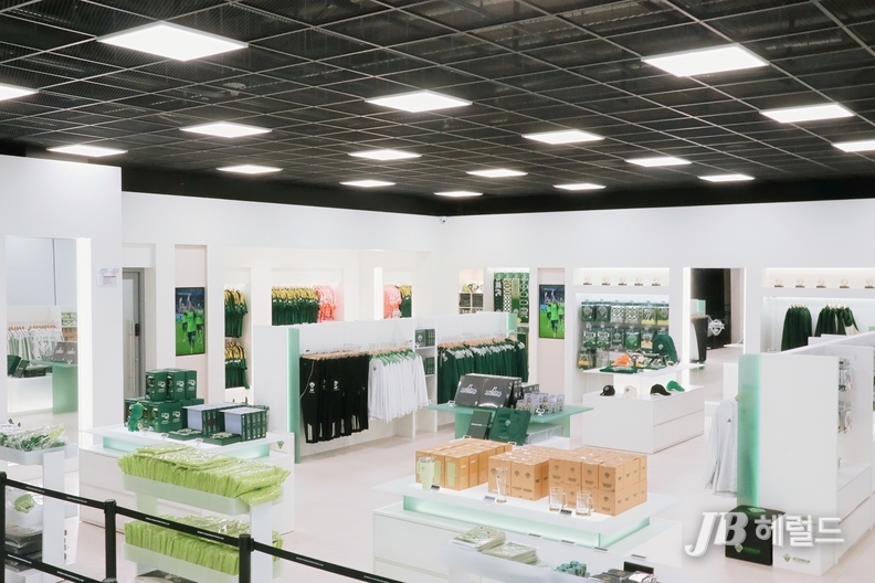 ‘오피셜 스토어’는 팀 컬러인 녹색을 돋보이게 하는 화이트 톤 기반의 밝고 모던한 분위기를 전반적으로 연출하고 있으며 벽면에는 대형 사이니지를 설치해 브랜드 아이덴티티를 노출할 수 있도록 조성했다.