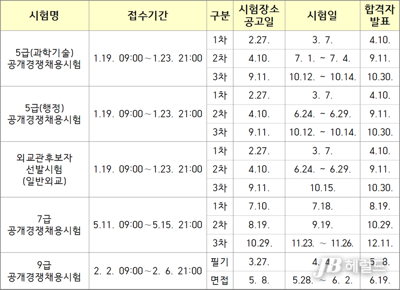 내년도 국가공무원 5급 및 외교관후보보자 1차 시험은 3월 7일, 7급 1차 시험 7월 18일, 9급 필기시험 4월 4일에 각각 치러진다.