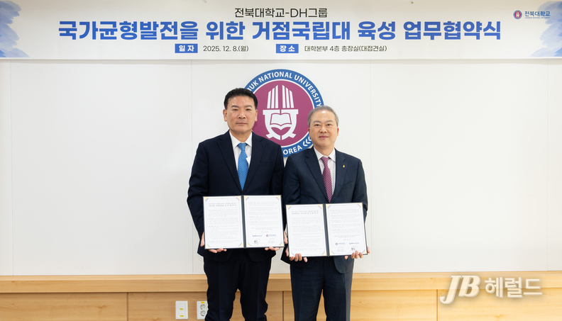 전북대는 12월 8일 대학본부에서 DH그룹과 ‘전북지역 및 거점국립대 육성을 위한 업무협약(MOU)’을 체결하고, 지역 인재 양성 및 취업 활성화를 위한 공동 프로젝트를 본격 추진하기로 했다.