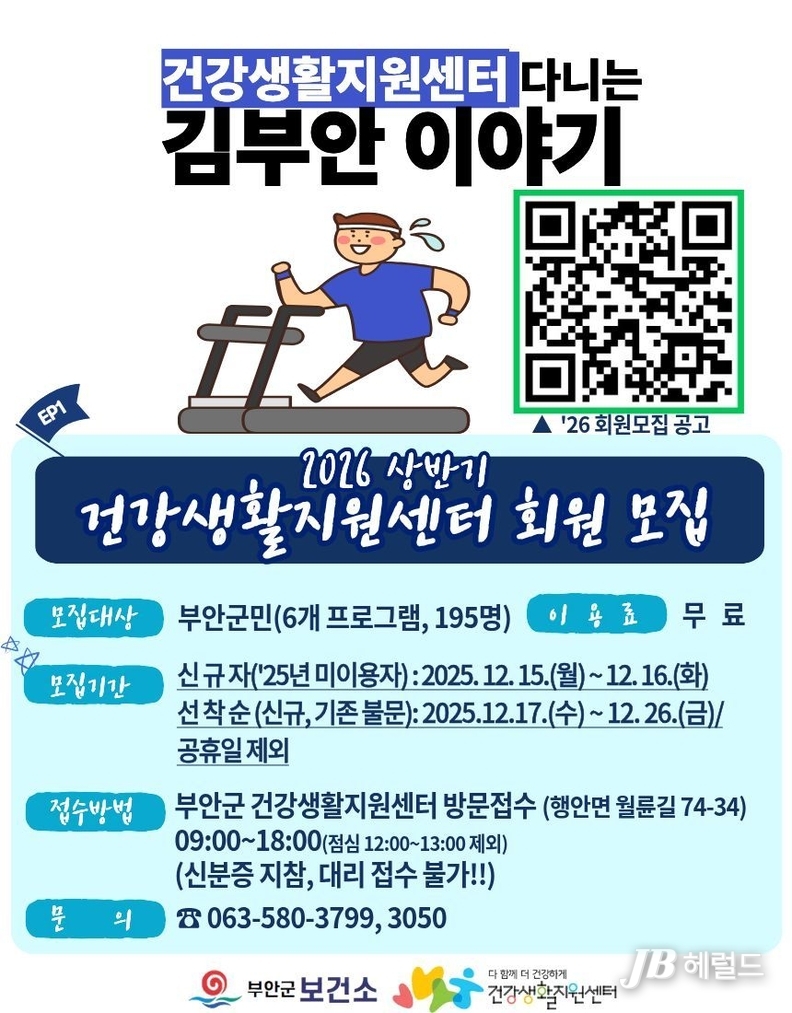 총모집 인원은 195명이다. 회원 모집은 오는 15일부터 시작된다. 오는 15~16일은 신규 이용자(2025년 미이용자) 우선 모집, 17~26일은 전체 부안군 성인 대상 선착순 모집으로 진행되며 접수는 건강생활지원센터 방문 접수만 가능하다. 이용료는 전액 무료다.