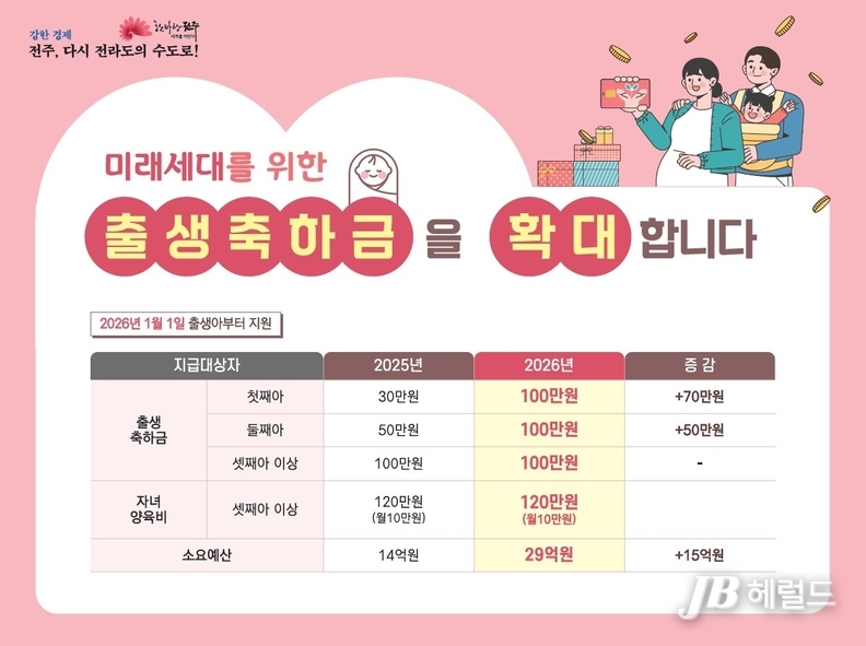 전주시는 2026년 1월 1일 이후 출생아에게 출생축하금 100만 원을 일시금으로 지급한다고 15일 밝혔다.