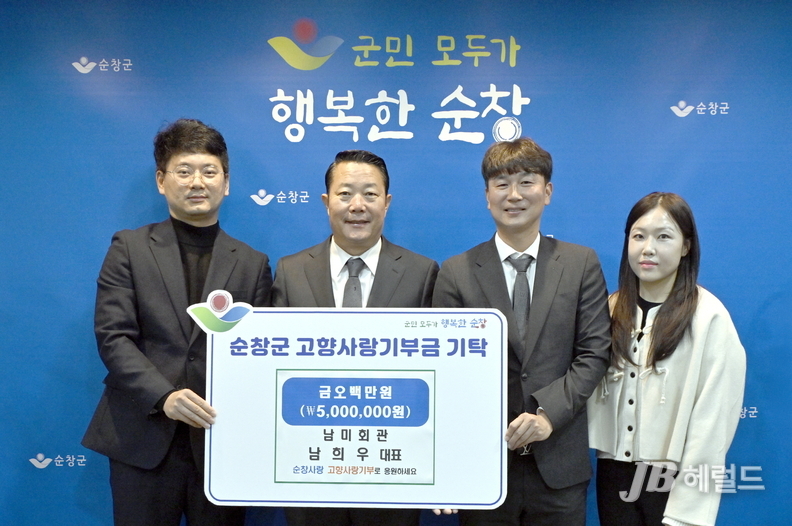 기부금을 전달받은 순창군 관계자는 "고향이 아님에도 순창군에 따뜻한 마음을 전해주신 남희우 대표에게 깊이 감사드린다"며 "보내주신 기부금은 군민 삶의 질 향상과 지역공동체 강화를 위해 꼭 필요한 곳에 소중히 사용하겠다"고 화답했다.