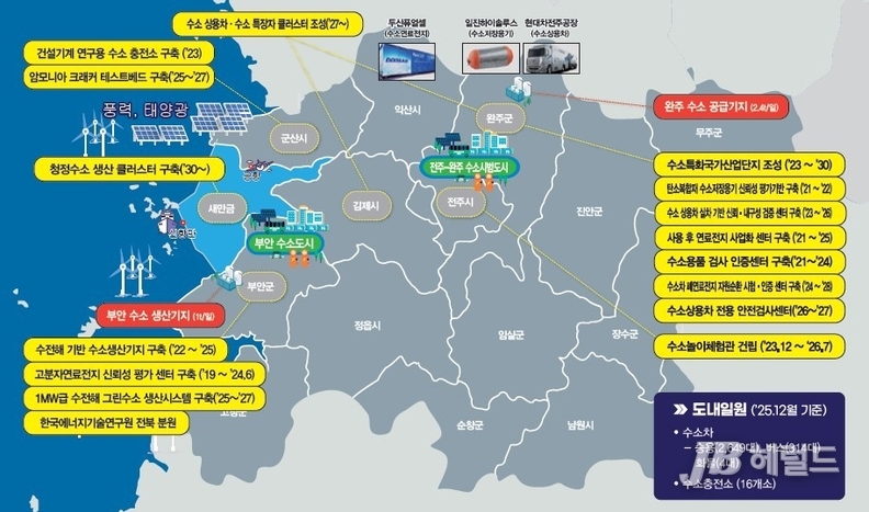 전북자치도는 2019년 정부의 수소경제 활성화 로드맵에 발맞춰 전라북도 수소산업 육성 기본계획을 수립한 이후 약 8331억 원 규모의 사업을 추진해 왔다. 분야별로는 기반 고도화에 1772억 원, 집적화 단지 조성에 5504억 원, 수소도시 조성에 830억 원, 기업과 연구개발 지원에 225억 원을 투입하며 산업 생태계 구축을 강화하고 있다.