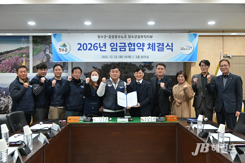 장수군은 26일 군청 2층 회의실에서 전국공공운수노조 전국자치단체공무직본부 장수군지부와 2025년 임금협약을 체결했다고 밝혔다.