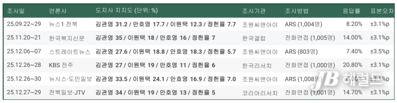 이후 2025년 12월 중하순에 실시된 스트레이트뉴스와 KBS전주 여론조사의 경우, 김관영 도지사의 지지율은 27%대로 다소 조정되지만 여전히 선두를 유지하고 있다. 반면 이원택 의원과 안호영 의원은 나란히 10% 후반대 지지율을 기록하며 오차범위 내 접전을 벌이고 있다. KBS전주 여론조사 이후 이원택 의원이 소폭 상승한 반면, 안호영 의원은 오히려 하락했다.