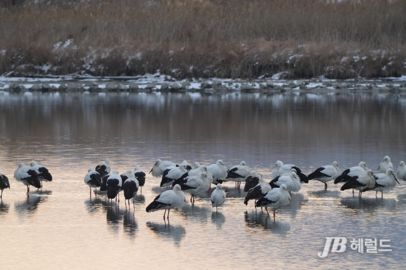 최근 새만금과 충남 서산시, 태안군 등 국내 주요 황새 월동지들이 한파로 결빙되면서, 얼지 않은 해리천으로 황새들이 집중적으로 이동한 것으로 분석된다.