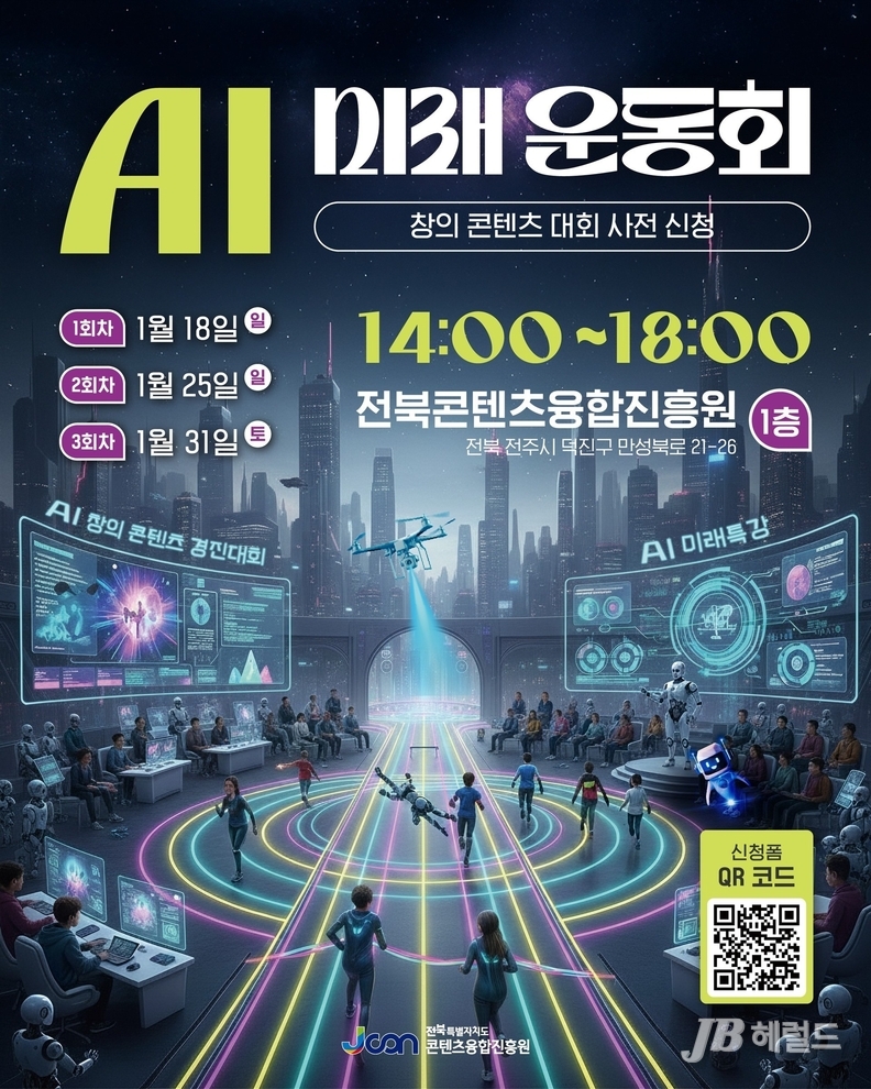전북특별자치도가 주최하고 전북특별자치도콘텐츠융합진흥원이 주관하는 ‘AI 미래운동회 & 창의 콘텐츠 대회’가 오는 1월 18일과 25일, 31일 등 총 3회에 걸쳐 진흥원 1층에서 개최된다.