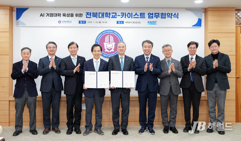27일 전북대학교 대학본부에서 전북대학교와 카이스트는 ‘AI 거점대학 육성을 위한 업무협약’을 체결하고 AI 교육과 연구 경쟁력 강화를 위한 협력 체계를 구축하기로 했다고 밝혔다.