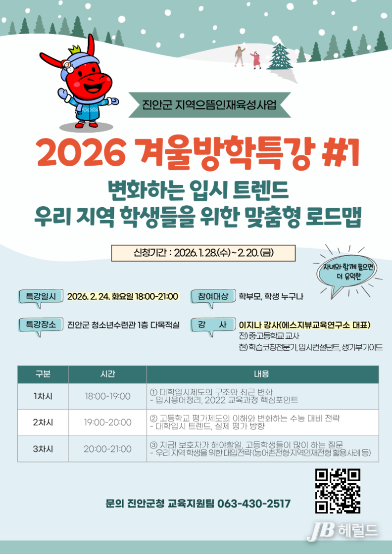 진안군은 30일 진안군 청소년수련관 등에서 관내 학생과 학부모를 대상으로 ‘2026 겨울방학 입시특강 및 1대1 맞춤형 컨설팅’을 운영한다고 밝혔다.