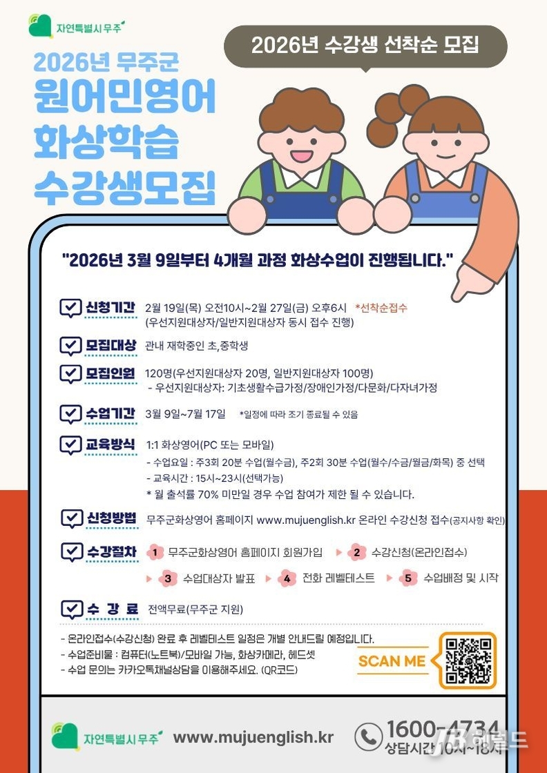 무주군은 27일까지 지역 내 초·중학생을 대상으로 ‘원어민 화상영어 지원사업’ 수강생 120명을 선착순 모집한다고 밝혔다.