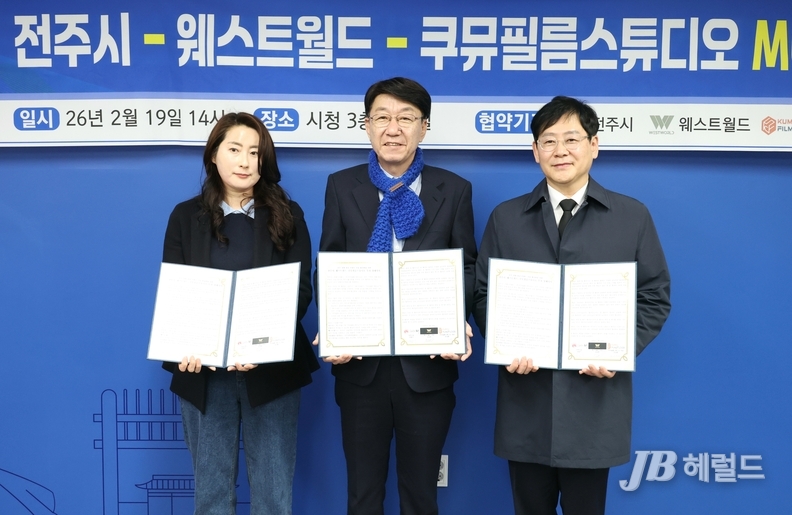 전주시는 19일 전주시청 3층 소회의실에서 영화영상산업 발전 및 투자 유치를 위한 양해각서를 체결했다고 밝혔다. 이날 협약식에는 우범기 전주시장과 손승현 웨스트월드 대표, 양수연 쿠뮤필름스튜디오 본부장 등이 참석했다.