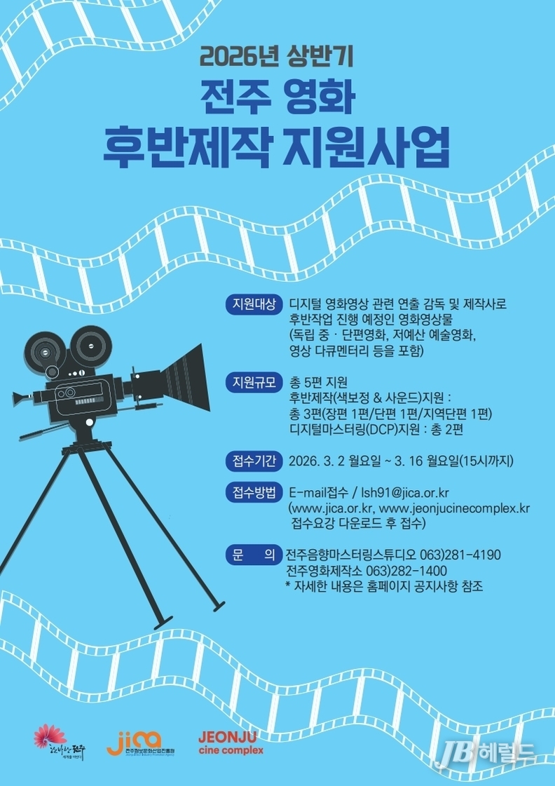 [전북뉴스] 전주시가 3월 16일까지 2026년 상반기 전주 영화 후반제작지원 사업 공모를 통해 전국 장편·단편 등 총 5편을 선정해 색보정·사운드·DCP 제작을 현물 지원한다.