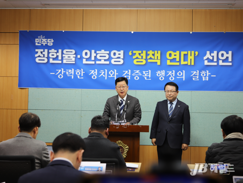 [전북뉴스] 전북도지사 선거에 나선 안호영 의원과 정헌율 익산시장이 3일 전북도의회 브리핑룸에서 기자회견을 열고 안 의원으로의 정책연대를 공식 선언했다.